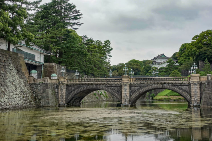 Après nous être perdus dans un monde d’images, nous repartons vers les jardins du palais impérial. Il faut se dépêcher, car il est déjà presque 17h et les jardins ferment tôt. Nous avons le temps d’admirer une des tours de garde, Yagura, et les ruines du château. Nous essayons de descendre voir les jardins, mais trop tard, le garde en vélo surveille et repousse tout touriste prétentieux voulant s’octroyer un temps supplémentaire dans les jardins. Il est temps d’aller voir le pont d’entrée du palais impérial, le nijubashi.